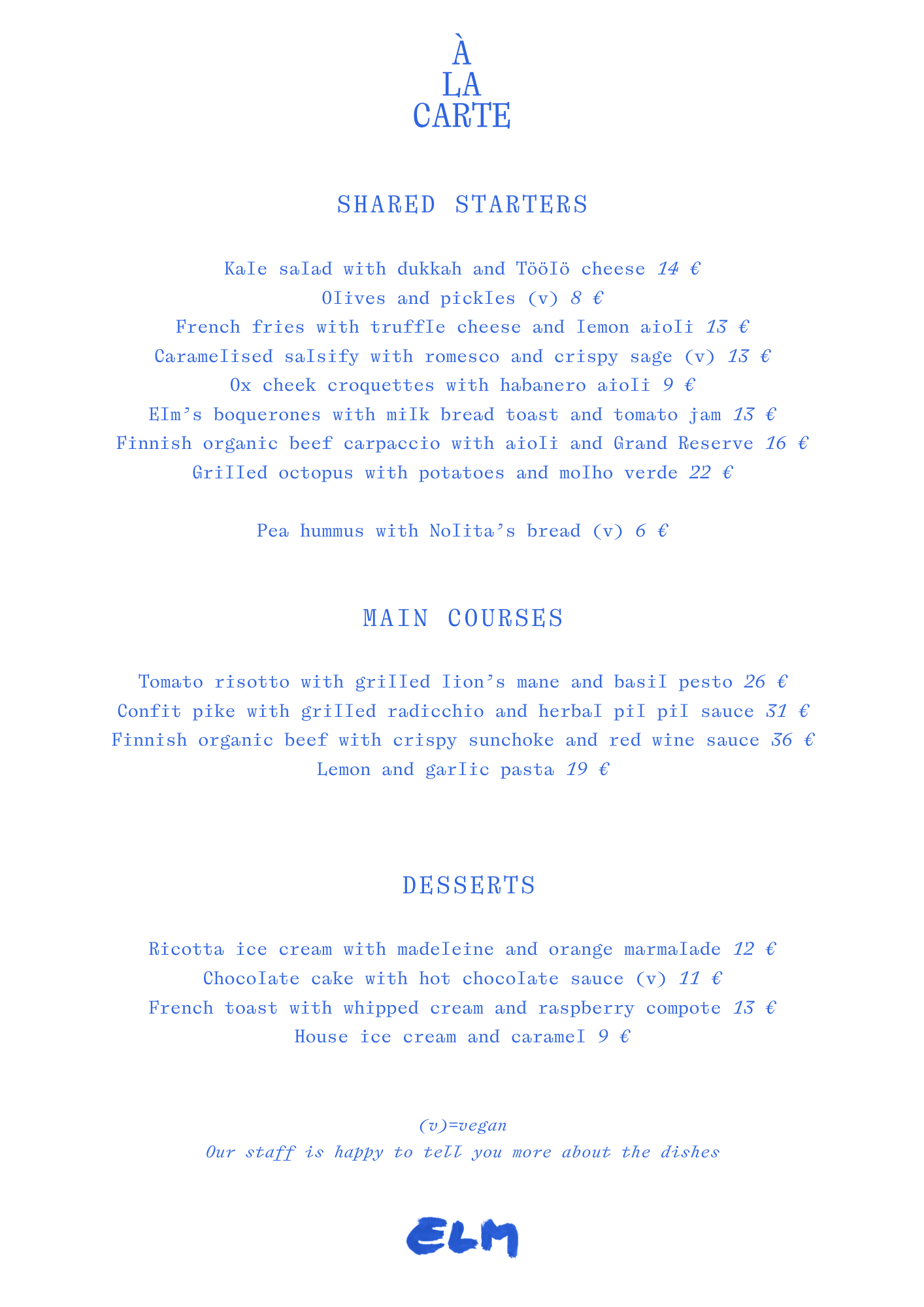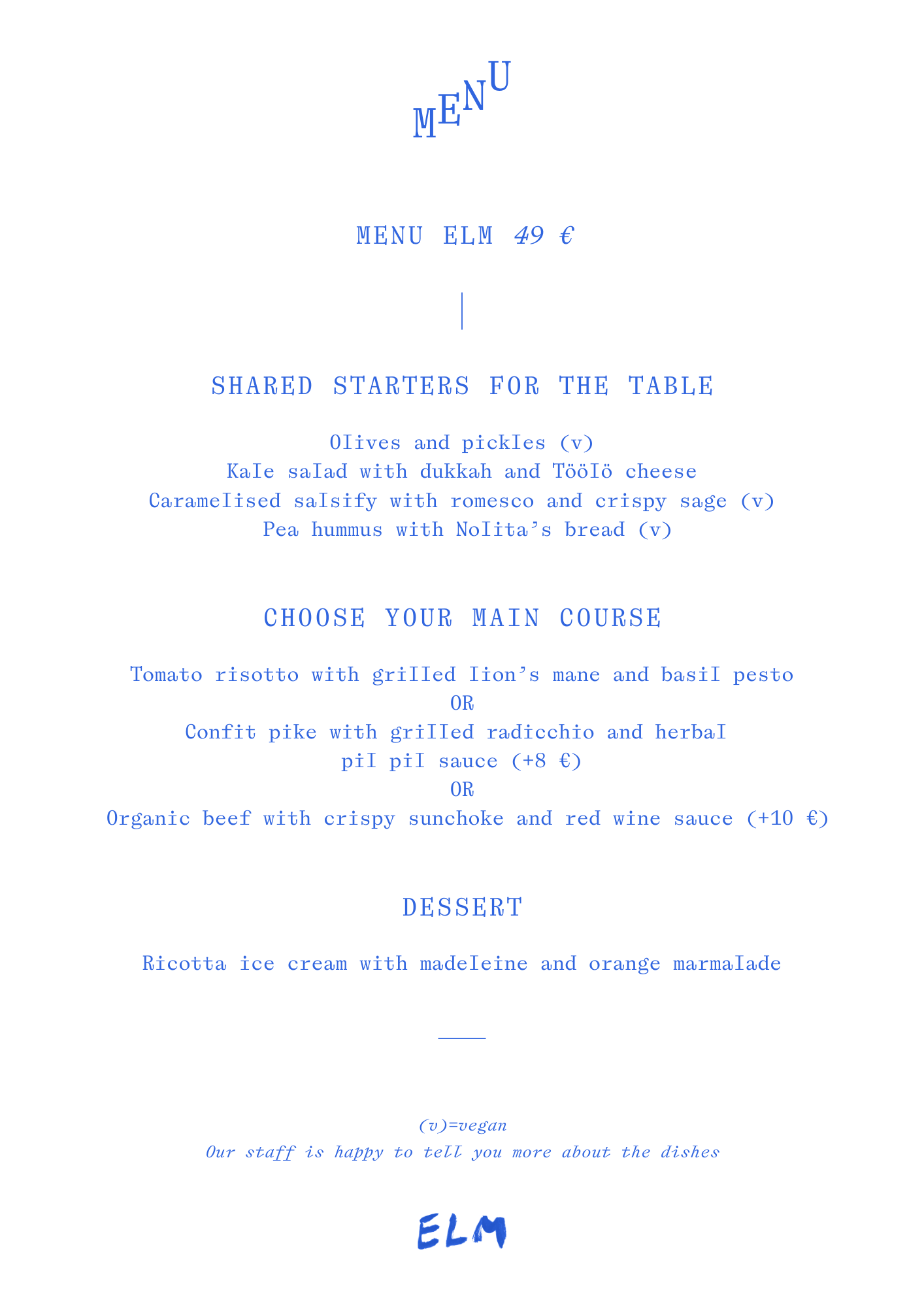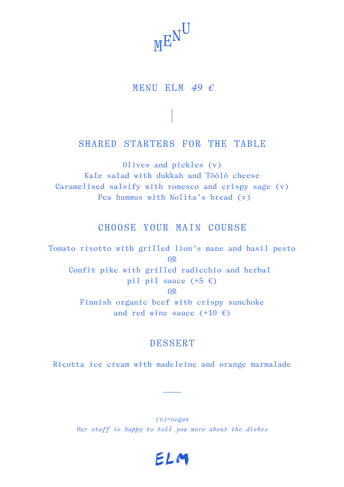 Restaurant Elm (2022) is restaurant on the edge of Kaivopuisto in South Helsinki serving lunch & dinner throughout the week. Our ingredient-driven cooking is guided by the seasons and our Mediterranean roots, offering simple dishes made with carefully selected ingredients. We warmly welcome both bookings and walk-ins—whether you’re stopping by for a quiet lunch, catching up over coffee, or sharing a long-table meal.