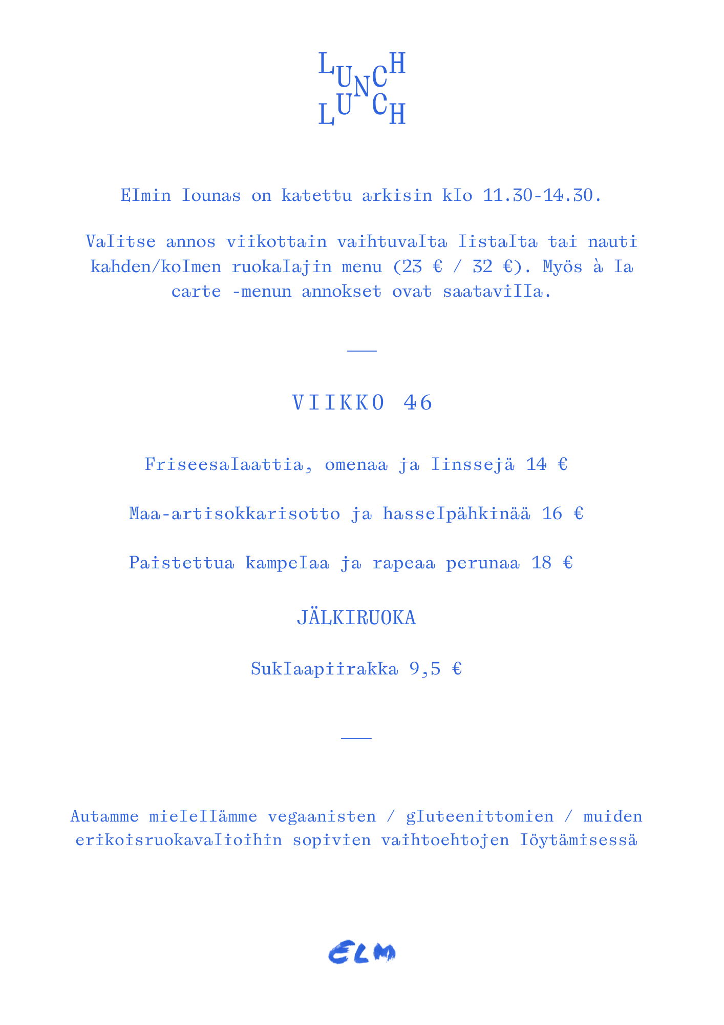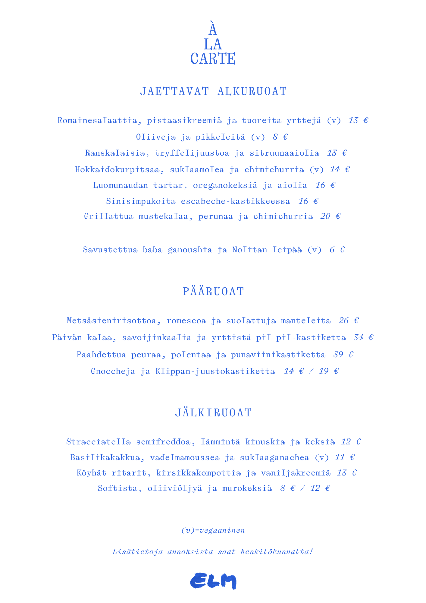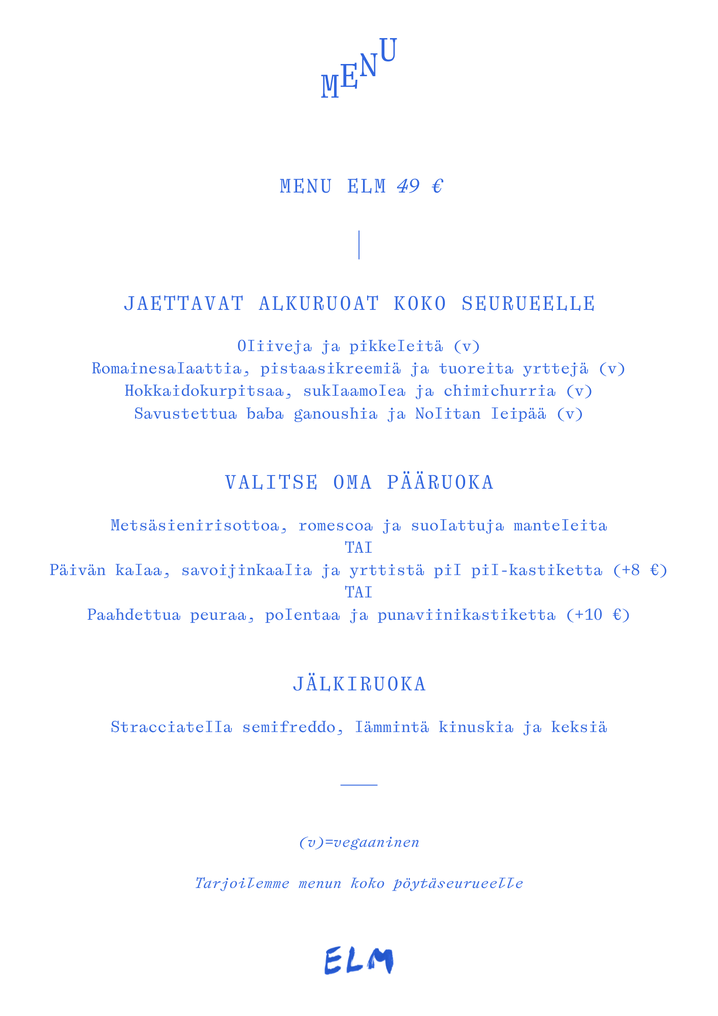 Ravintola Elm on lämminhenkinen kortteliravintola, jossa laitetaan mutkatonta ruokaa välimeren makujen ja sesongin tuoreimpien raaka-aineiden inspiroimana. Meillä voit piipahtaa päiväkahvilla, levähtää lounaan äärellä tai nauttia illallista pitkän kaavan mukaan. Olet lämpimästi tervetullut itseksesi, isommalla porukalla tai vaikka koirakaverin kanssa – varaa pöytä tai tule yllätysvierailulle.