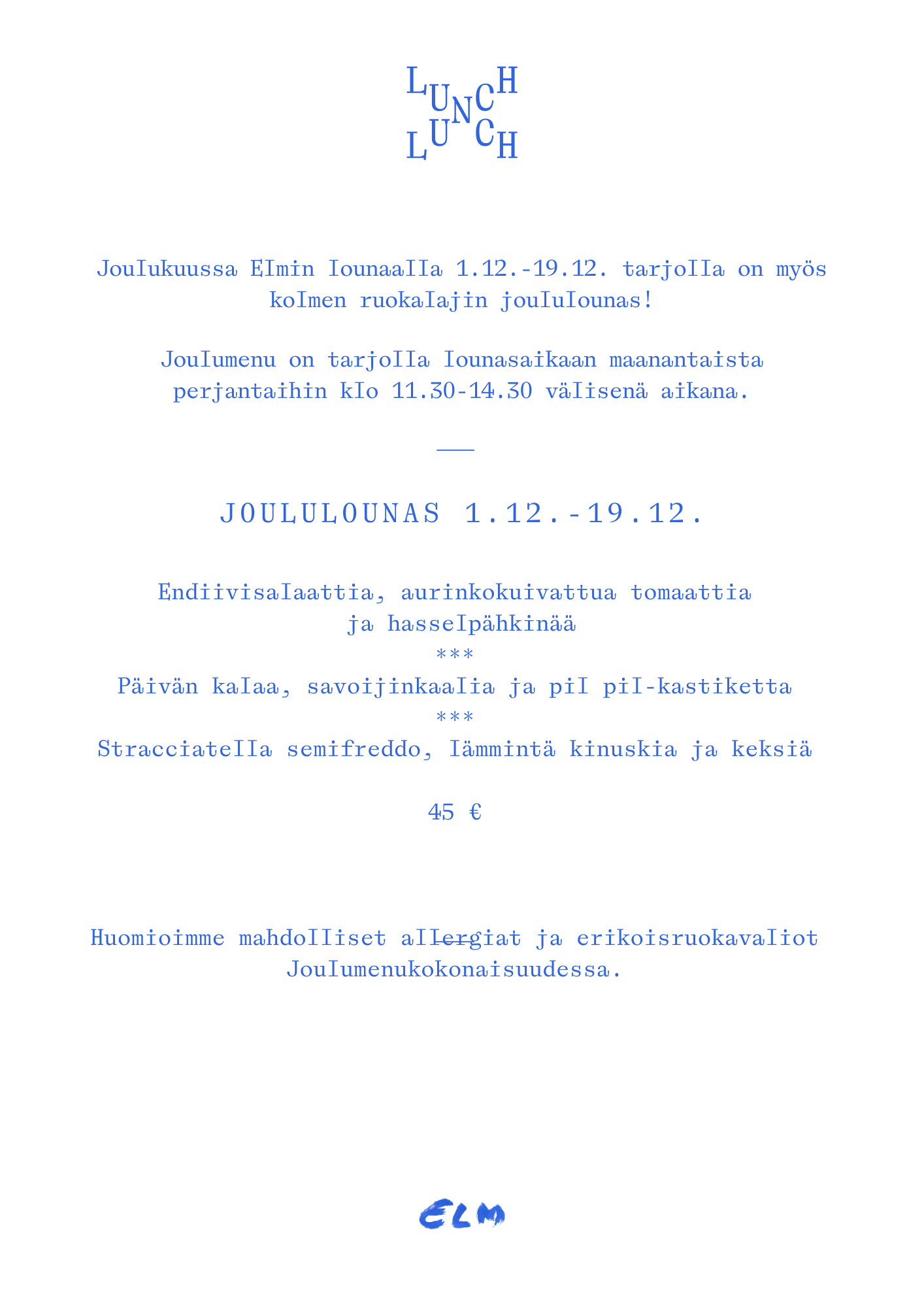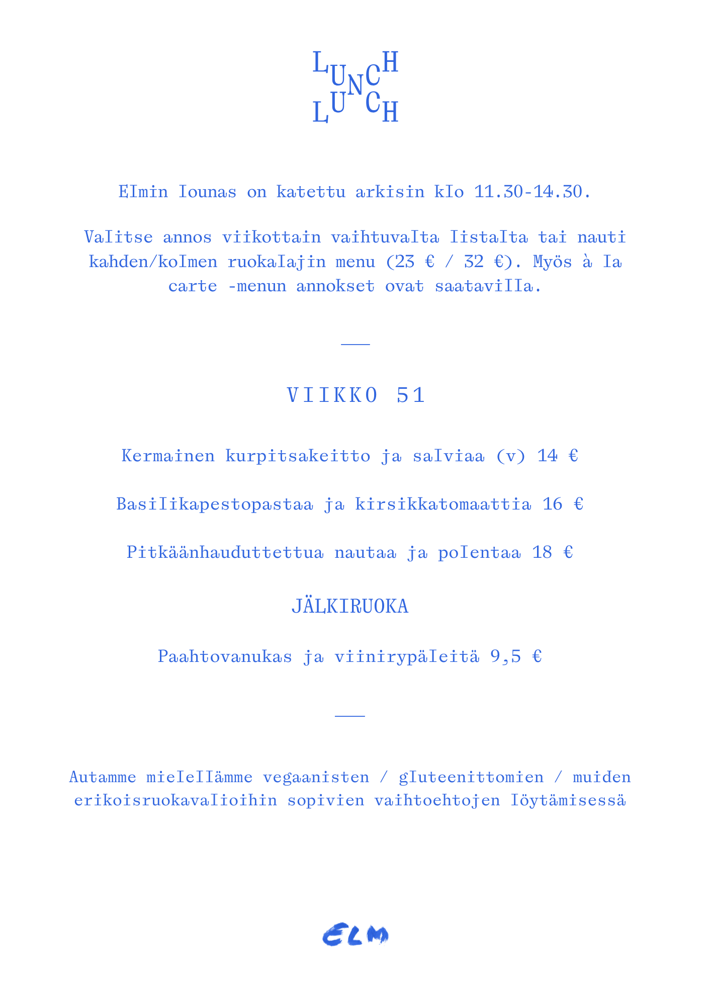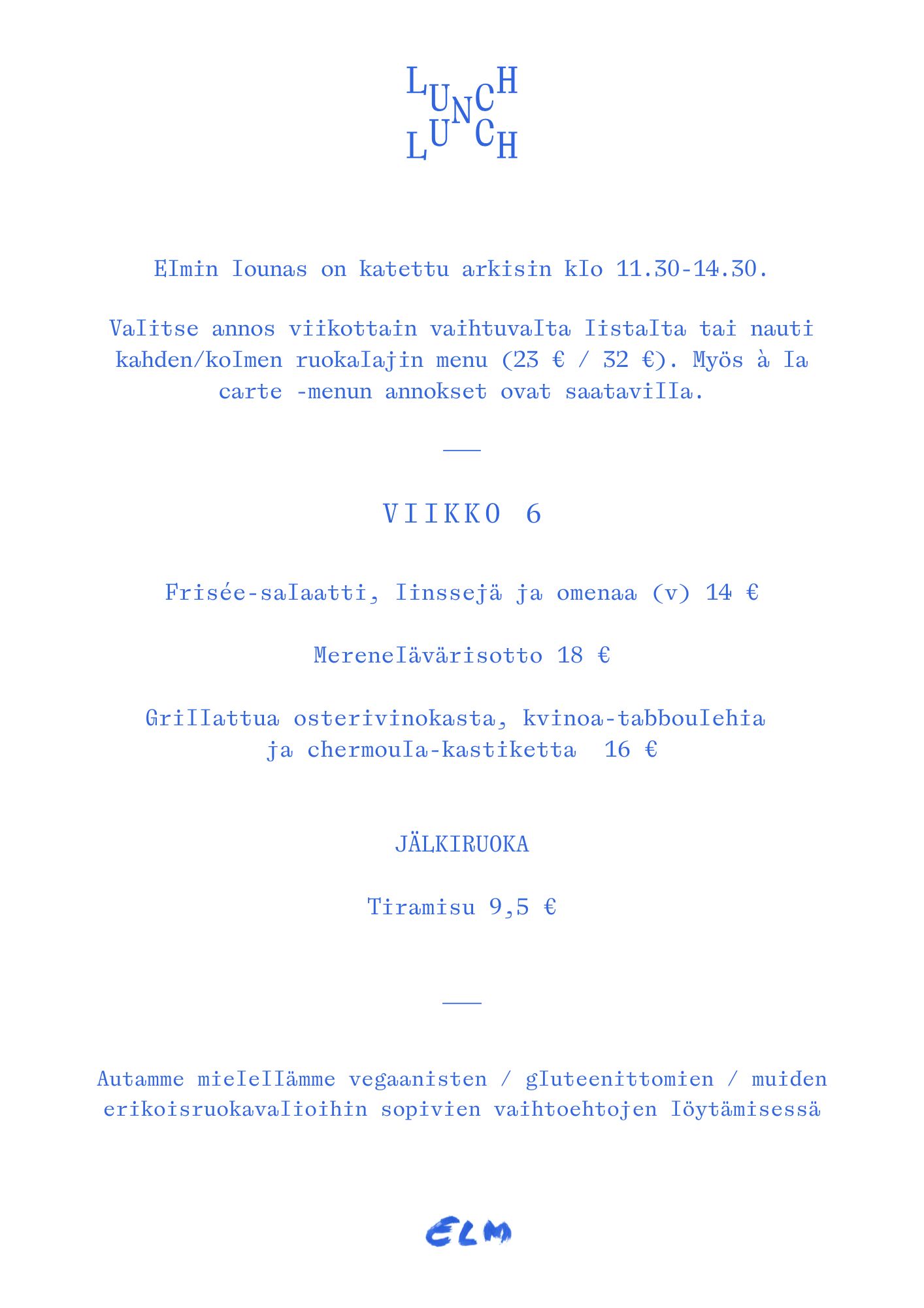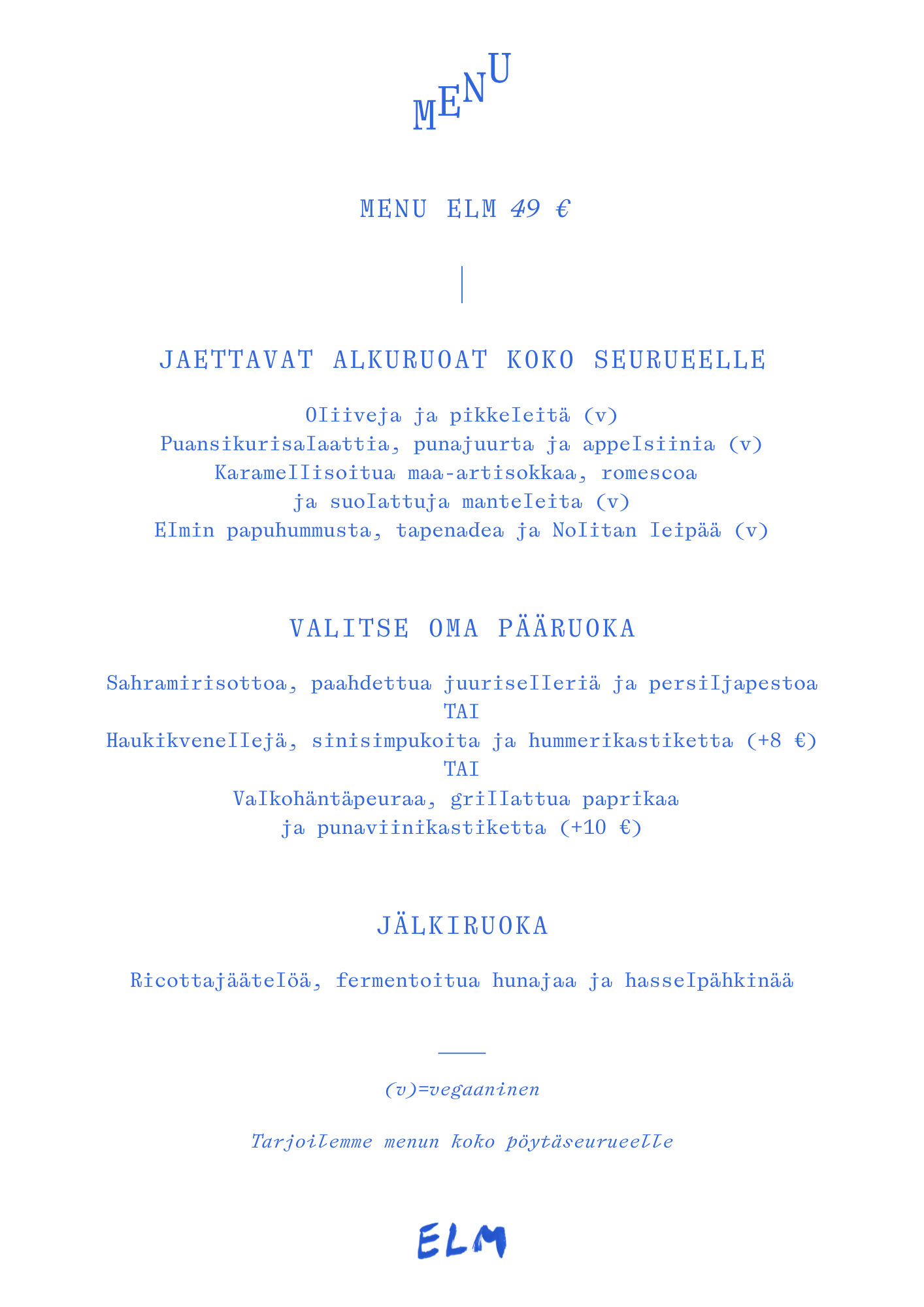 Ravintola Elm on lämminhenkinen kortteliravintola, jossa laitetaan mutkatonta ruokaa välimeren makujen ja sesongin tuoreimpien raaka-aineiden inspiroimana. Meillä voit piipahtaa päiväkahvilla, levähtää lounaan äärellä tai nauttia illallista pitkän kaavan mukaan. Olet lämpimästi tervetullut itseksesi, isommalla porukalla tai vaikka koirakaverin kanssa – varaa pöytä tai tule yllätysvierailulle.